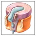 A disc between the L4 and 5 vertebras is known as L4-5 disc. Since we all have heard the word "slipped disc" let's understand the disc a bit better. A disc is made up of a soft gel like centre (blue in the next picture) and a tough outer lining (maroon in the picture). It works like a shock absorber in our spine. A tear in the outer tough structure can make the soft gel protrude out which is known as a disc prolapse. Sometimes a portion of the gel comes out and hangs loose in the spinal canal, which is known as a sequestrated disc. The picture below shows various stages of the disc disase. Whenever the outer tough part tears we experience an episode of back pain. If the disease is untreated it can progress to a prolapse and if the disc prolepses then it pinches the exiting nerve as shown below.