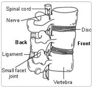 The feeling of pain starts in the tiniest of nerve endings in the skin. The nerve fibres join up to form nerves which run under the skin to the spine. In the spine, the nerves form a thick rope called the spinal cord, which runs inside the bones of the spine to the brain. If something presses on or irritates the nerve as it runs between the bones of the spine to join the spinal cord, you will feel pain not so much in the spine as in the skin where the nerve started. The bones of the spine (vertebrae) are like a tower of 24 hollow bricks held together by rubbery plates called discs. The spinal cord runs through the hollow centre of each vertebra. The spinal cord has a special covering called the dura. It is quite common for the nerve endings from the back of the thigh down to the foot to be pressed on by a disc bulging out between two of the lower vertebrae. This causes pain down the back of the thigh, calf and foot called sciatica and also some back pain.